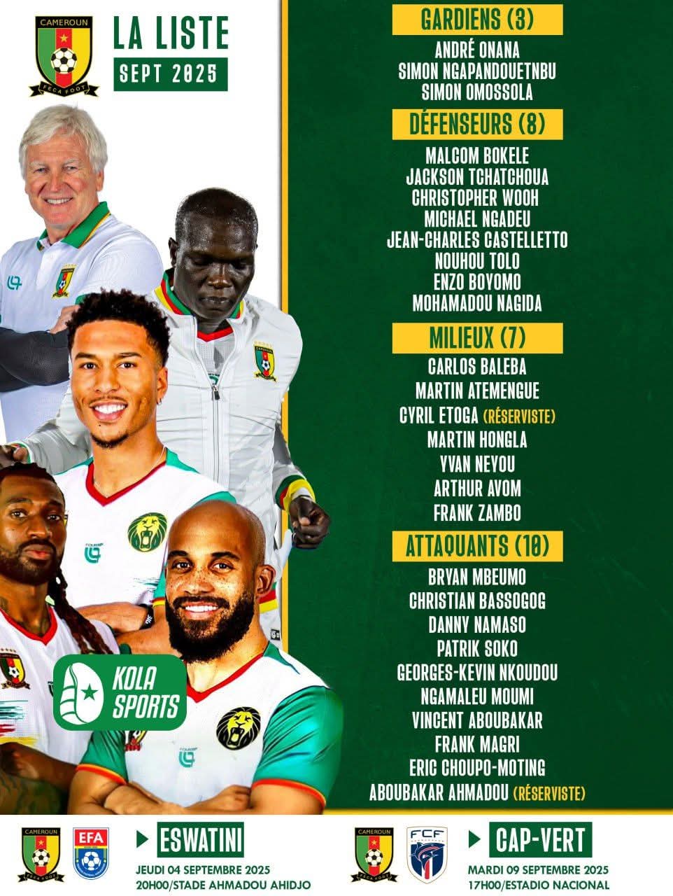 Chez les gardiens, pas de surprise : André Onana, malgré une saison contrastée à Manchester United, reste le numéro un. Il sera épaulé par Simon Ngapanduentbu et Simon Omossola. En défense, Enzo Boyomo (Osasuna) fait figure de révélation et pourrait bousculer la hiérarchie. L’absence remarquée de Fai Collins nourrit déjà les débats.