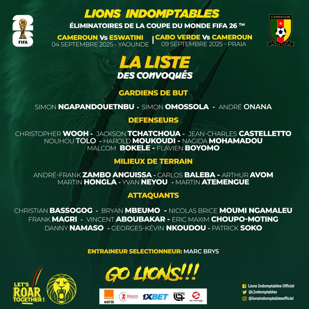 La tanière des Lions Indomptables s’anime à nouveau. Ce vendredi 29 août, le sélectionneur Marc Brys a levé le voile sur une liste de 26 joueurs convoqués pour affronter l’Eswatini (4 septembre, Yaoundé) et le Cap-Vert (9 septembre, Praia) dans le cadre des éliminatoires du Mondial 2026.