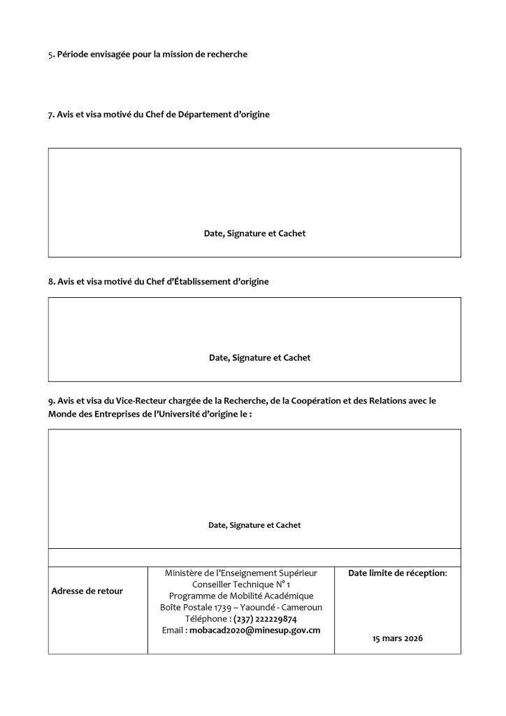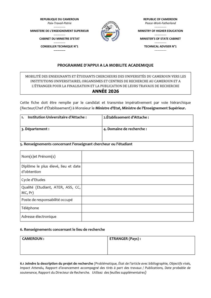 Ce dispositif vise à soutenir la finalisation de travaux scientifiques, aussi bien au Cameroun qu’à l’étranger, dans des laboratoires partenaires ou des institutions de référence. L’objectif est double : renforcer la production scientifique nationale et accroître la visibilité internationale des universités camerounaises.